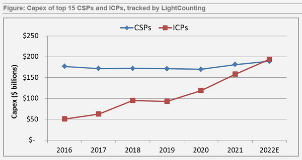 ICC訊(編譯:Nina)LightCounting(LC)今年早些時候報告稱,2022年將是交叉的一年,因為LightCounting跟蹤的前15家互聯(lián)網內容提供商(ICP)的支出超過了前15家通信服務提供商(CSP)的資本支出。2022年支出的實際增長可能略低,因為許多ICP和CSP在報告第三季度財務數(shù)據(jù)弱于預期后,正在仔細審視其支出,但2022年的交叉仍很有可能。