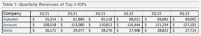 表1和表2說明了前三大ICP報告的季度收入和支出。Alphabet的廣告收入增長正在放緩,Meta的收入在今年第一季度和第三季度都有所下降。