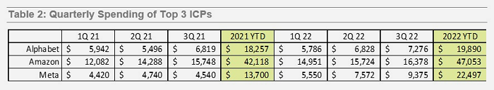對比表2中相同三家ICP在2021和2022年前三個季度的資本支出可以發(fā)現(xiàn),雖然環(huán)比增長不明顯,但今年迄今為止的資本支出同比顯著上升。到目前為止,Alphabet在2022年前三季度的支出同比增加16億美元,亞馬遜同比多了近50億美元,Meta同比多了近90億美元。