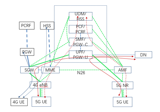 5G基站部署初期,覆蓋區(qū)域不完善,為了保障業(yè)務的連續(xù)性及用戶的體驗,需要4G/5G協(xié)同互操作。在Option 2中,當5G終端不在5G覆蓋范圍內(nèi),需要回落到4G網(wǎng)絡。由于5G終端單連接基站,且5G核心網(wǎng)只和5G基站連接,4G/5G的互操作只能在核心網(wǎng)之間通過N26接口完成。4G/5G互操作如圖2所示。