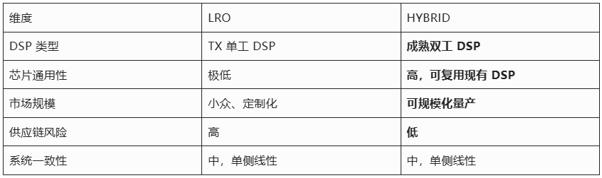 在這一并行體系中,HYBRID(半 DSP)方案作為一種工程化程度更高的中間形態(tài),正在顯示出比典型 LRO 更優(yōu)的系統(tǒng)與產(chǎn)業(yè)綜合價(jià)值。