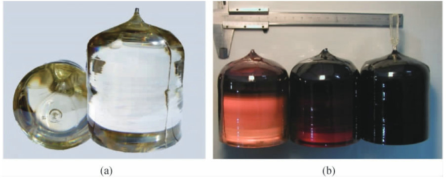 圖2 (a)3英寸光學(xué)級(jí)名義純同成分鈮酸鋰晶體;(b)摻鐵鈮酸鋰晶體