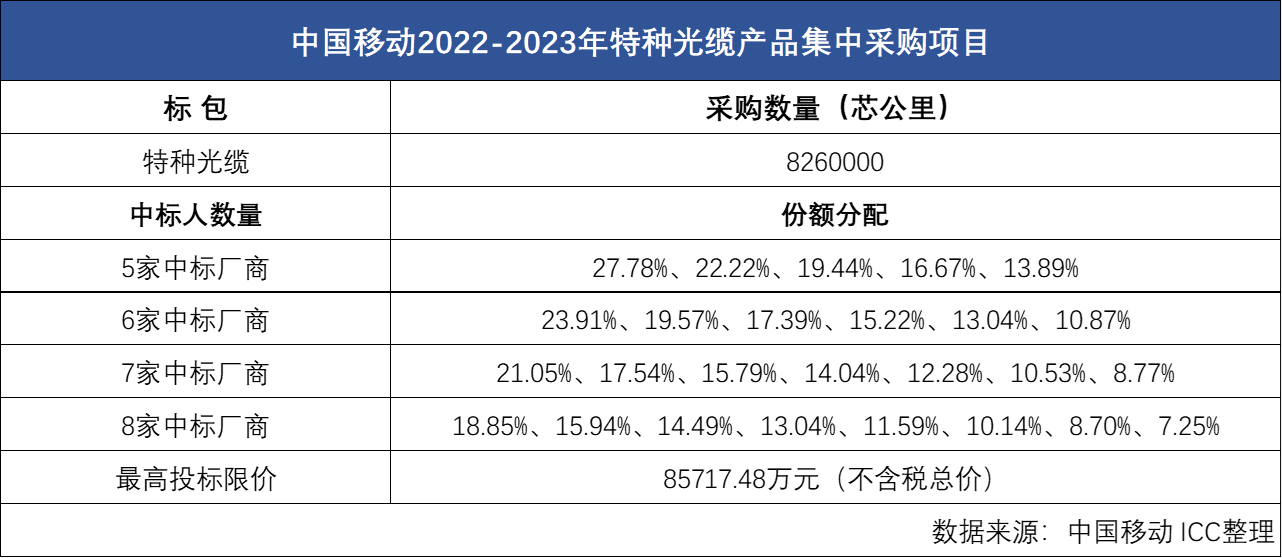 ICC訊 10月25日,中國移動發(fā)布2022-2023年特種光纜產(chǎn)品集中采購項目,其采購特種光纜產(chǎn)品預(yù)估規(guī)模共計24.81萬皮廠公里,折合約826萬芯公里。