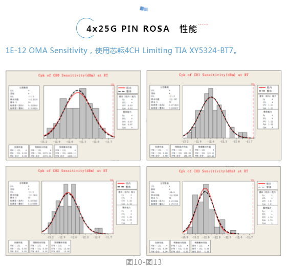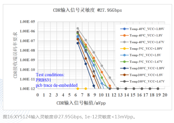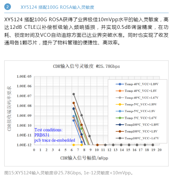 該方案實測指標完全滿足IEEE802.3ba協(xié)議要求,收端靈敏度指標可以實現3dB以上的余量(-11.6dBm@1e-12 OMA)。集成XY5324 TIA的PIN ROSA,搭配XY5124 CDR靈敏度全溫保證-11.6 dBm,典型值-12.5dBm,優(yōu)于目前業(yè)界主流國際大廠方案的表現。