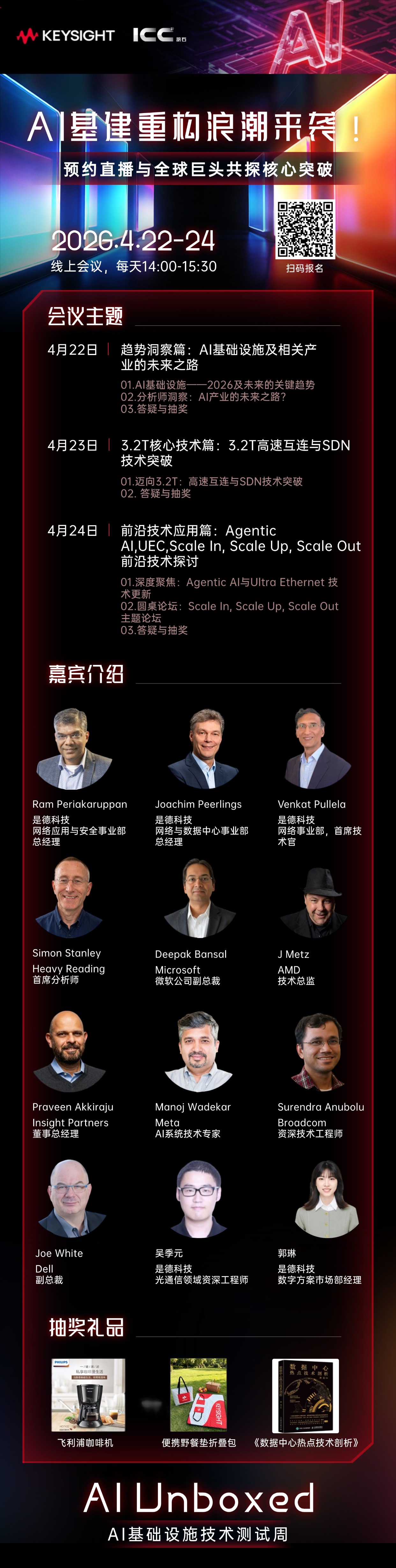 4月22-24日,是德科技重磅打造AI Unboxed:AI基礎(chǔ)設(shè)施技術(shù)測試周,以線上會(huì)議形式,匯聚全球科技巨頭智慧,直擊AI基建核心痛點(diǎn),特別邀請微軟、Meta、AMD、戴爾、博通等國際頂尖企業(yè)的十余位技術(shù)專家與高層領(lǐng)袖,聯(lián)合Heavy Reading資深分析師、是德科技核心技術(shù)團(tuán)隊(duì),圍繞AI基礎(chǔ)設(shè)施核心技術(shù)展開深度拆解,從趨勢研判到技術(shù)攻堅(jiān),從前沿探索到實(shí)戰(zhàn)展望,全方位解析AI基建重構(gòu)的機(jī)遇與挑戰(zhàn)。