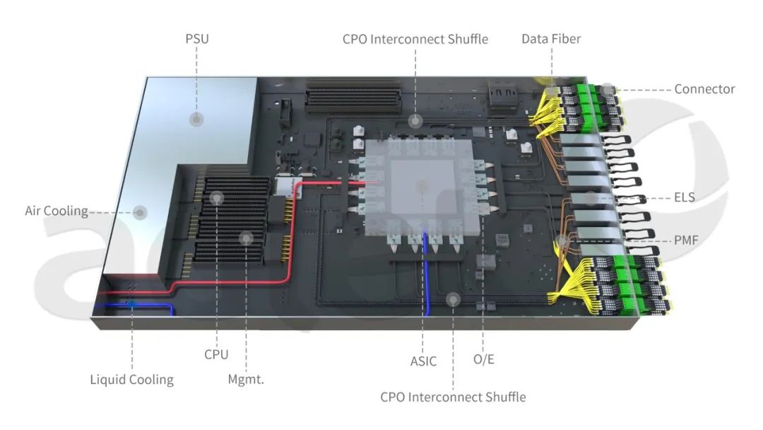 1. 超高密度光纖:單個ASIC的數(shù)據(jù)流量需支持多達1024根光纖。2. 有限空間限制:交換機內部空間有限,光纖需與電源模塊(PSU)、散熱系統(tǒng)(風扇、液冷等)、數(shù)據(jù)平面(ASIC)、O/E、控制平面(CPU)、管理接口及連接器共享空間。3. 實現(xiàn)跨連接需求:外部激光源(ELS)需要通過保偏光纖(PMF)進行連接,為提升穩(wěn)定性和可維護性,ELS已與O/E分離。這些線纜需在交換機狹小的空間內實現(xiàn)整齊排列并緊密布(即彎曲半徑極?。?。