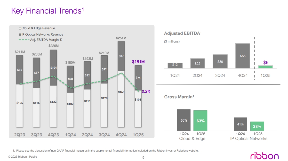 2025年第一季度Ribbon收入為1.81億美元,而2024年第一季度為1.8億美元,基本持平。GAAP毛利率為45.4%,而2024年第一季度為51.2%。非GAAP毛利率為48.6%,而2024年第一季度為55.1%。GAAP營(yíng)業(yè)虧損為2000萬(wàn)美元,而2024年第一季度為1300萬(wàn)美元。