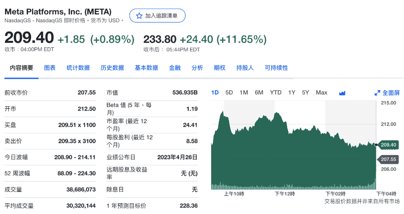 Meta 周三在納斯達(dá)克交易所的開(kāi)盤(pán)價(jià)為 212.50 美元。截至周三收盤(pán),Meta 股價(jià)上漲 1.85 美元,報(bào)收于 209.40 美元,漲幅為 0.89%。截至美國(guó)東部時(shí)間周三 17:44 分 (北京時(shí)間周四 5:44 分),Meta 股價(jià)在盤(pán)后交易中上漲 24.40 美元至 233.80 美元,漲幅為 11.65%。過(guò)去 52 周,Meta 股價(jià)最高為 224.30 美元,最低為 88.09 美元。