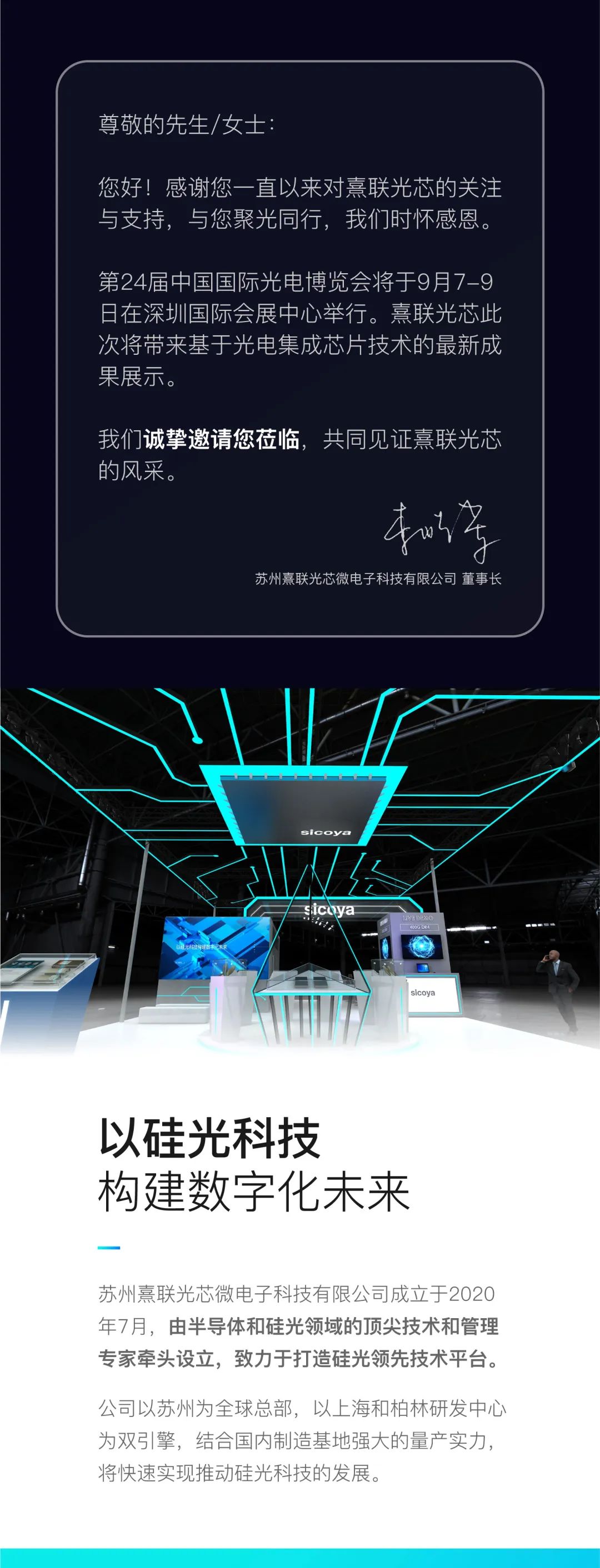 ICC訊 第24屆中國國際光電博覽會(CIOE 2022)將于9月7-9日在深圳國際會展中心舉行。蘇州熹聯(lián)光芯(Sicoya Global)首次亮相CIOE 2022,此次將帶來基于光電集成芯片技術(shù)的最新成果展示,展位號6號館6A28,歡迎廣大光電行業(yè)朋友及客戶蒞臨交流與合作。