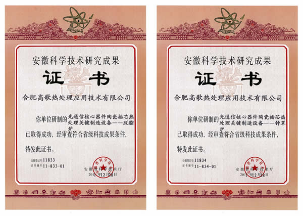 高歌公司于2011年向安徽省科技廳申報九項(xiàng)省級科技成果,經(jīng)過專家組的評審論證,全部通過鑒定,并正式授予科研成果證書,其中光通訊核心器件陶瓷插芯熱處理關(guān)鍵制造設(shè)備—鐘罩爐、光通訊核心器件陶瓷插芯熱處理關(guān)鍵制造設(shè)備—脫脂爐共兩項(xiàng)成果。
