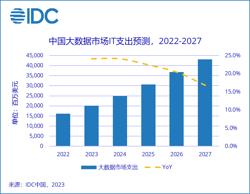 聚焦中國(guó)市場(chǎng),IDC預(yù)計(jì),2027年中國(guó)大數(shù)據(jù)IT投資規(guī)模有望達(dá)到430億美元,全球占比約8%,五年復(fù)合增長(zhǎng)率約為21.5%,增速位居全球第一。