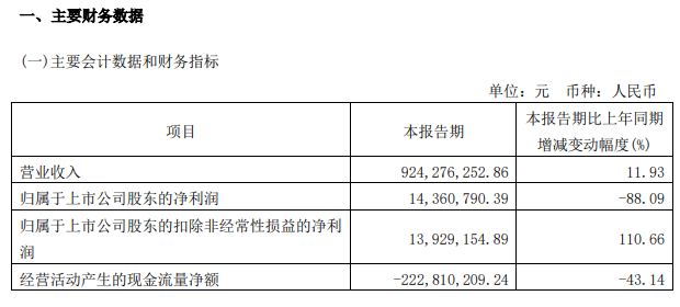 ICC訊 4月28日,永鼎股份(600105)發(fā)布2022年第一季度報告,報告期內(nèi)公司實現(xiàn)營業(yè)收入9.24億元,同比增長11.93%;歸屬于上市公司股東的凈利潤14,36萬元,同比下滑88.09%。