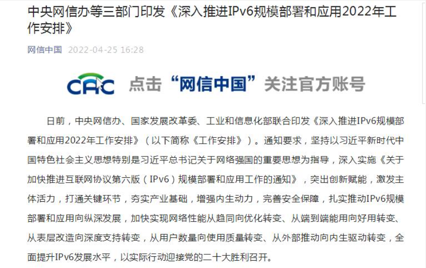 四是拓展行業(yè)融合應(yīng)用。包括深化中央企業(yè)行業(yè)系統(tǒng)IPv6 改造、提升金融機(jī)構(gòu)IPv6 支持能力和創(chuàng)新應(yīng)用水平、加快工業(yè)互聯(lián)網(wǎng)平臺(tái)IPv6 升級(jí)改造、推進(jìn)農(nóng)業(yè)農(nóng)村信息化IPv6 升級(jí)改造、深化社會(huì)信息化IPv6 改造、推進(jìn)交通數(shù)字化設(shè)施IPv6 應(yīng)用、深化水利行業(yè)IPv6 部署應(yīng)用、加大自然資源與生態(tài)環(huán)境信息化IPv6 改造力度、推動(dòng)應(yīng)急管理業(yè)務(wù)系統(tǒng)和終端支持IPv6、開(kāi)展電力企業(yè)統(tǒng)一互聯(lián)網(wǎng)出口IPv6 改造升級(jí)、推動(dòng)IPv6 在全媒體傳播體系應(yīng)用。