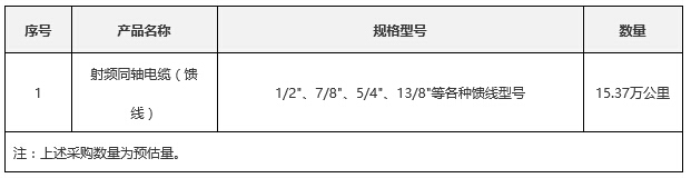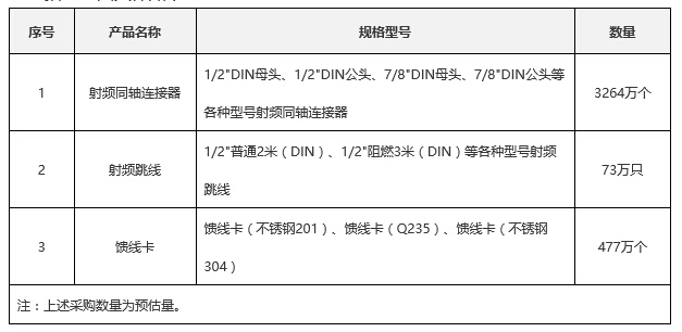 ICCSZ訊(編輯:Debi)6月22日,中國電信宣布啟動2016年饋線配件產品集采,包含射頻同軸連接器、射頻跳線、饋線卡三大類,總規(guī)模約3800萬個;同時還啟動2016年射頻同軸電纜(饋線)產品集采項目,包含1/2"、7/8"、5/4"、13/8"等各種饋線型號共15.37萬公里。