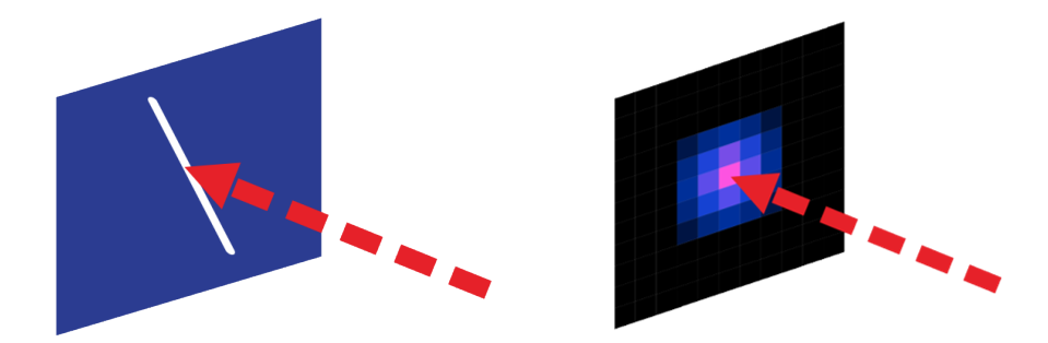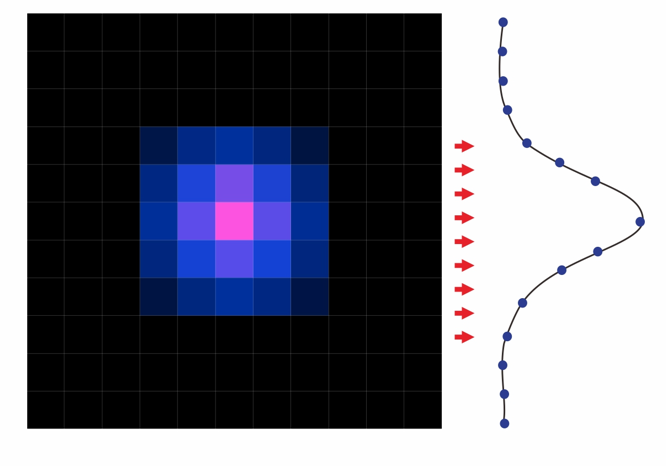 狹縫式基于其狹縫掃描的測(cè)試原理,用狹縫依次掃描光斑的不同位置,所有透過(guò)狹縫的光將被采集,相當(dāng)于光在狹縫的方向(圖中紅色箭頭)上進(jìn)行累加,得到圖片右側(cè)輪廓的點(diǎn),進(jìn)而擬合出高斯輪廓。