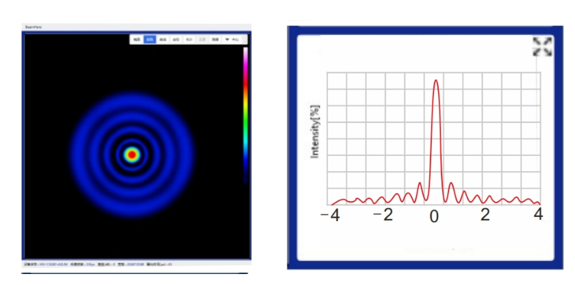 在實(shí)際激光應(yīng)用中,光斑并非總是呈高斯分布的基橫模形態(tài),往往會(huì)出現(xiàn)許多不規(guī)則分布或高階橫模的情況。比如光鑷系統(tǒng)中的貝塞爾光束,我們希望能量盡可能集中在中心光斑處,所以用光斑分析儀來(lái)驗(yàn)證其質(zhì)量。