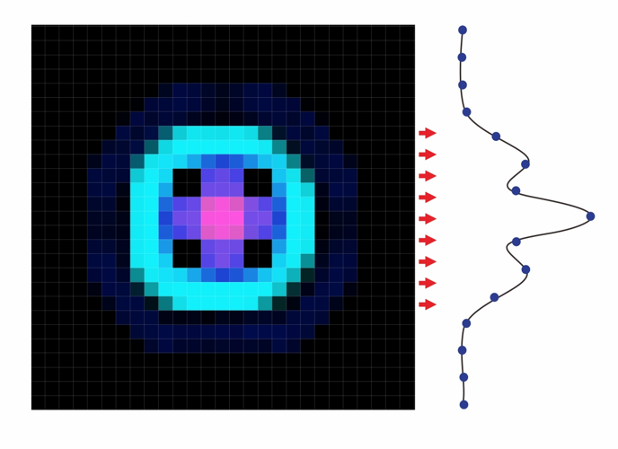 同樣,光在狹縫的方向(圖中紅色箭頭)上進(jìn)行累加,得到圖片右側(cè)輪廓的點(diǎn),但復(fù)雜的光斑在狹縫方向上還是存在的非規(guī)則的能量分布,累加后就失去了這個(gè)能量分布的信息。得到輪廓曲線是光斑在這個(gè)輪廓方向上的總和輪廓,光斑中的凹陷細(xì)節(jié)失真了。