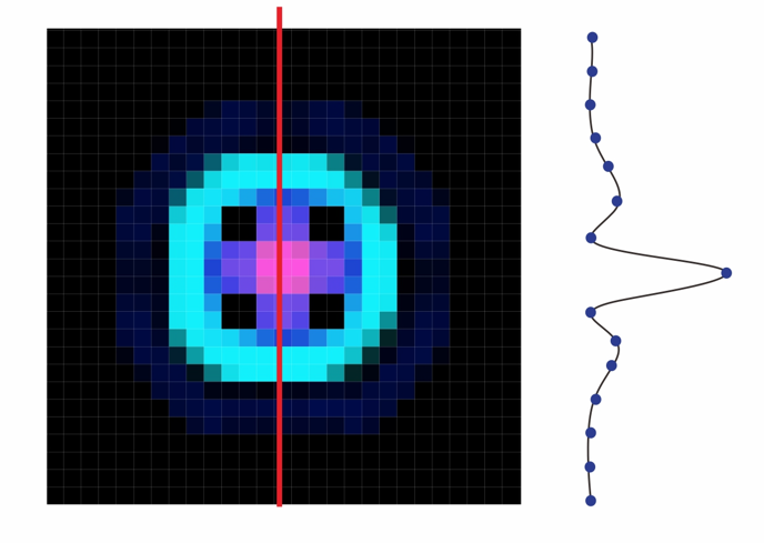 相機(jī)式基于相機(jī)靶面成像的原理,光斑的形態(tài)由眾多像素的亮暗程度給出,所以我們只需要取光斑中心的一列像素值(圖中紅線)就可以得到一個(gè)側(cè)面輪廓圖。