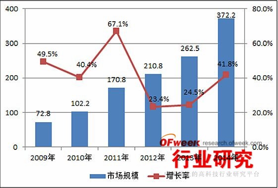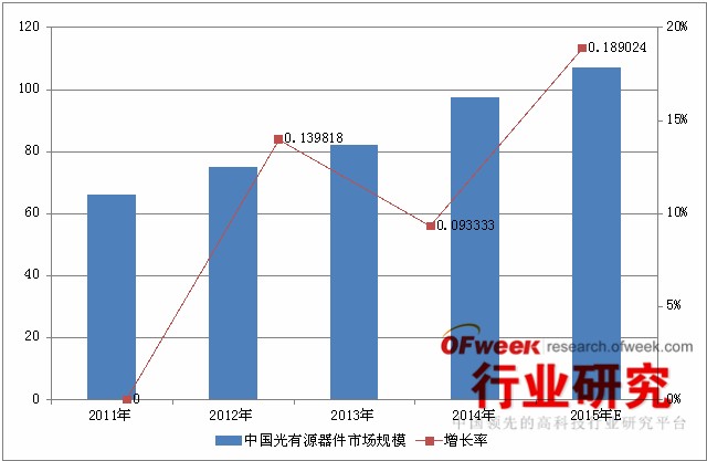 據(jù)OFweek行業(yè)研究中心出版的《2015-2018年中國光有源器件市場分析及前景預(yù)測報告》顯示,2011年-2014年中國光有源器件市場規(guī)模增長較快,年復(fù)合增長率達到14%。未來幾年會有所放緩,年復(fù)合增長率會降至10%左右。2014年中國光有源器件市場規(guī)模為97.5億元人民幣,估計2015年將達到107億元。