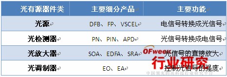 圖表1 光有源器件主要分類及功能