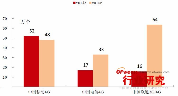 圖表3 2014、2015年三大運營商新增4G基站數(shù)量(單位:萬個)