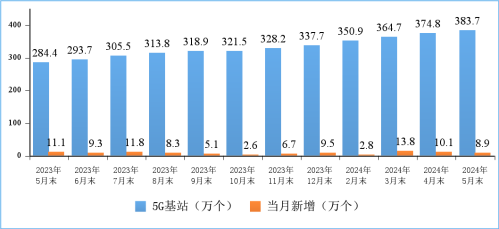 5G網(wǎng)絡建設穩(wěn)步推進。截至5月末,5G基站總數(shù)達383.7萬個,比上年末凈增46萬個,占移動基站總數(shù)的32.4%,占比較1-4月份提高0.7個百分點。