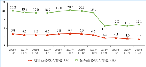 電信業(yè)務收入增速放緩,電信業(yè)務總量保持兩位數(shù)增長。1-5月份,電信業(yè)務收入累計完成7387億元,同比增長3.7%,增速較1-4月份回落0.3個百分點。按照上年不變價計算的電信業(yè)務總量同比增長11.9%。