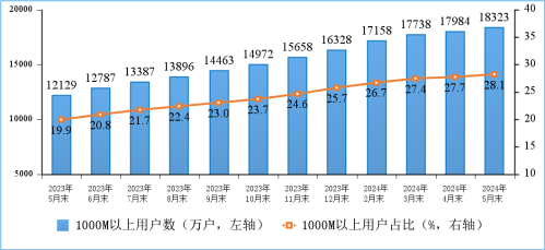 固定寬帶接入用戶規(guī)模穩(wěn)步增加,千兆用戶數(shù)持續(xù)擴大。截至5月末,三家基礎電信企業(yè)的固定互聯(lián)網(wǎng)寬帶接入用戶總數(shù)達6.52億戶,比上年末凈增1534萬戶。其中,100Mbps及以上接入速率的固定互聯(lián)網(wǎng)寬帶接入用戶達6.17億戶,占總用戶數(shù)的94.6%;1000Mbps及以上接入速率的固定互聯(lián)網(wǎng)寬帶接入用戶達1.83億戶,比上年末凈增1996萬戶,占總用戶數(shù)的28.1%,占比較上年末提升2.4個百分點。在高速率用戶持續(xù)增長拉動下,家庭戶均接入帶寬達481Mbps/戶,同比增長18.7%。