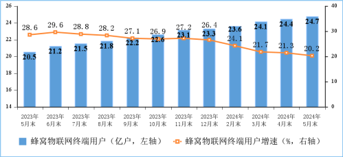 蜂窩物聯(lián)網(wǎng)用戶規(guī)??焖贁U張,IPTV(網(wǎng)絡電視)用戶穩(wěn)步增加。截至5月末,三家基礎電信企業(yè)發(fā)展蜂窩物聯(lián)網(wǎng)終端用戶24.65億戶,比上年末凈增1.33億戶,占移動網(wǎng)終端連接數(shù)(包括移動電話用戶和蜂窩物聯(lián)網(wǎng)終端用戶)的比重達58.3%。IPTV(網(wǎng)絡電視)總用戶數(shù)達4.04億戶,比上年末凈增259萬戶。