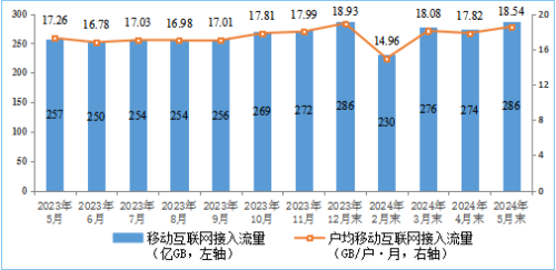 移動互聯(lián)網(wǎng)流量較快增長,5月DOU值處于高位。1-5月份,移動互聯(lián)網(wǎng)累計流量【見注1】達1323億GB,同比增長12.7%,增速較1-4月份回落0.5個百分點。截至5月末,移動互聯(lián)網(wǎng)用戶數(shù)【見注1】達15.45億戶,比上年末凈增2078萬戶。5月當月戶均移動互聯(lián)網(wǎng)接入流量(DOU)達到18.54GB/戶·月,同比增長7.4%,比上年底低0.39GB/戶·月。