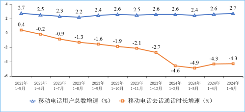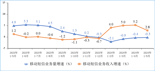 移動電話通話量和短信量小幅下降,移動短信業(yè)務收入保持增長。1-5月份,移動電話去話通話時長完成8916億分鐘,同比下降4.3%;固定電話主叫通話時長完成314億分鐘,同比下降3.7%。1-5月份,全國移動短信業(yè)務量同比下降0.3%;移動短信業(yè)務收入同比增長2.8%。
