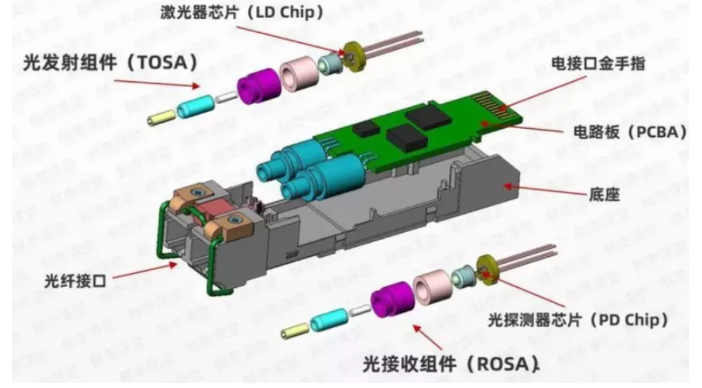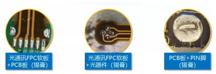 一個(gè)光模塊,通常由光發(fā)射器件(TOSA,含激光器)、光接收器件(ROSA,含光探測器)、功能電路和光(電)接口等部分組成。由于光模塊本身集成度高,且大量使用FPC軟板,因此激光焊接相較于傳統(tǒng)的烙鐵焊接、熱風(fēng)焊接、HotBar焊接、電子壓焊、波峰焊接等更適用于光通訊模塊的制造。