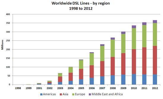 調(diào)研公司Point Topic近日公布數(shù)據(jù)稱,全球DSL連接數(shù)去年第四季度首次出現(xiàn)下滑,降至約3.67億,但綜合來(lái)看,目前DSL仍占全球?qū)拵нB接總數(shù)的57%。