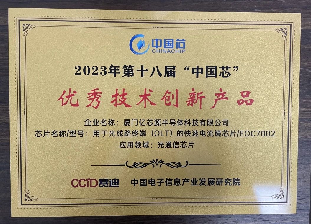 ICC訊 9月20日,由中國電子信息產(chǎn)業(yè)發(fā)展研究院、橫琴粵澳深度合作區(qū)執(zhí)行委員會、珠海市人民政府聯(lián)合主辦的2023琴珠澳集成電路產(chǎn)業(yè)促進(jìn)峰會暨第十八屆“中國芯”頒獎儀式在珠海順利召開。本次峰會聚焦中國集成電路產(chǎn)業(yè)的前沿成果,廈門億芯源研發(fā)的用于光線路終端(OLT)的快速電流鏡芯片(EOC7002),憑借出色的產(chǎn)品自主創(chuàng)新力在285家企業(yè)的398款參賽芯片產(chǎn)品中脫穎而出,榮獲第十八屆“中國芯”優(yōu)秀技術(shù)創(chuàng)新產(chǎn)品。