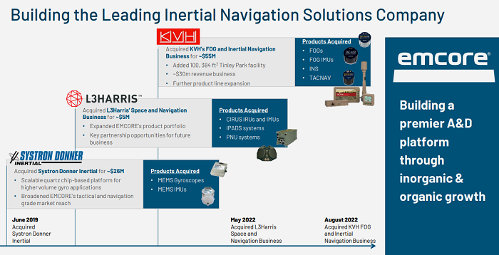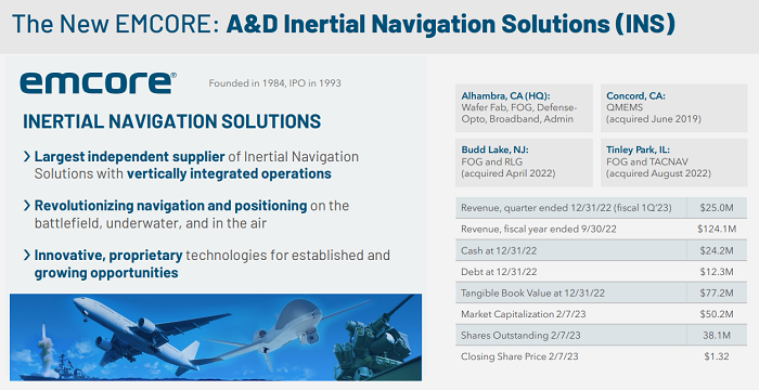 2022年,Emcore完成了對KVH Industries的慣性導(dǎo)航產(chǎn)品線(Inertial Navigation product)的收購,以及對L3Harris Technologies的空間和導(dǎo)航業(yè)務(wù)的收購,使其成為世界上最大的獨(dú)立慣性導(dǎo)航解決方案提供商。截至2022年12月31日的2023財年第一季度,Emcore總營收為2500萬美元,其中2170萬美元來自航空航天和國防(A&D)部門,330萬美元來自寬帶部門。