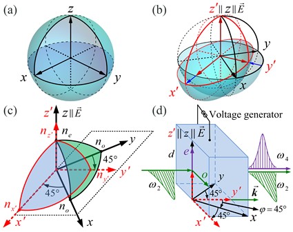 立方材料和(c)DKDP晶體電光效應(yīng)折射率橢球變化;(d)電壓調(diào)諧DKDP晶體四次諧波產(chǎn)生。