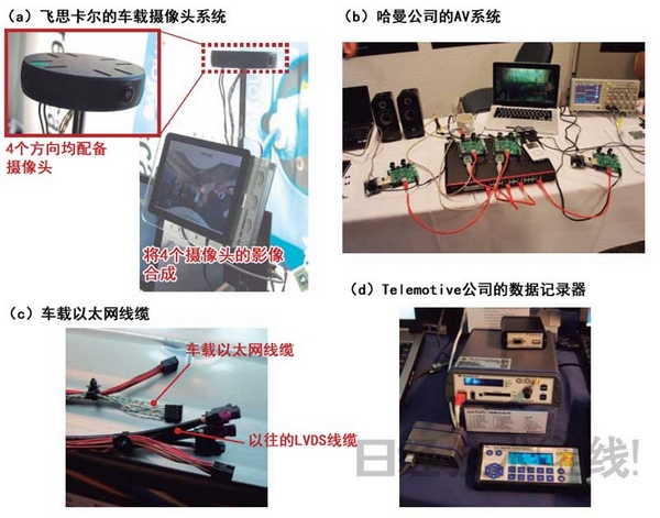 在2012年9月于德國(guó)舉行的“2nd Ethernet & IP @ Automotive Technology Day”上,各企業(yè)紛紛公開(kāi)了利用車(chē)載以太網(wǎng)的演示。例如,飛思卡爾展示了攝像頭系統(tǒng)(a)。與寶馬預(yù)定2013年采用的車(chē)載攝像頭系統(tǒng)采用基本相同的構(gòu)成。哈曼展示了計(jì)劃2014年實(shí)用化的AV系統(tǒng),S-Y Systems Technologies Europe展示了車(chē)載以太網(wǎng)用線纜(b、c)。由于實(shí)用化近在眼前,數(shù)據(jù)記錄器等工具也大量展出(d)。
