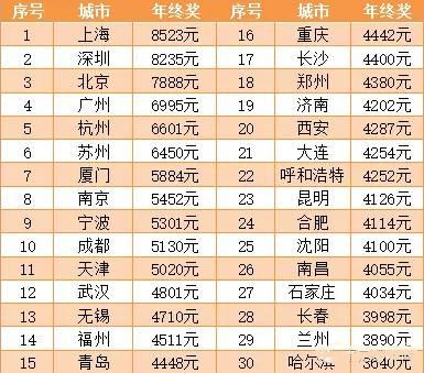 截至目前,已經(jīng)拿到年終獎的比例僅為13.4%,20.5%的白領表示企業(yè)承諾年后發(fā)放。從行業(yè)看,最令人艷羨的依舊是金融業(yè),年終獎平均高達1.7萬元。根據(jù)網(wǎng)絡消息報導:互聯(lián)網(wǎng)企業(yè)一些大咖的年終獎簡直就是一個壕。百度年會上李彥宏曾宣布,員工最高拿到50個月工資。阿里員工自爆,按月薪2萬來算,能拿到15個月年終獎,加上3000股股票,相當于100個月的工資。騰訊除了游戲和微信兩個土豪事業(yè)部以外,北京員工能拿到0-4個月年終獎。網(wǎng)易有17薪,也就是5個月的年終獎,如果公司業(yè)績好可能會多發(fā)一個月過節(jié)費。下圖為各大城市年終獎排行榜: