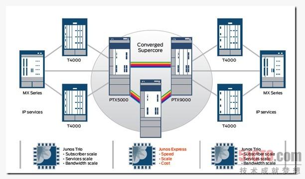 Juniper日前發(fā)布一系列超級(jí)核心網(wǎng)(Supercore)設(shè)備,主要是Junos Express chipset和PTX系列超級(jí)核心分組傳輸交換機(jī)(Supercore Packet Transport Switch)。Juniper對(duì)超級(jí)核心網(wǎng)的解決方案著重在于集成的傳輸(transport)和交換(switch)。PTX產(chǎn)品說白了,就是交換機(jī),是容量超大、集成了光傳輸和IP/MPLS的交換機(jī)。