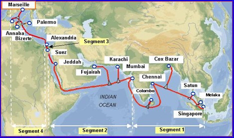Sea-Me-We 5海底電纜全長(zhǎng)20000千米,初始速率為24Tbps,連接法國(guó)到新加坡,沿途登陸意大利、埃及、阿拉伯、吉布提、也門、阿聯(lián)酋、阿曼、巴基斯坦、印度、斯里蘭卡、孟加拉國(guó)、緬甸、泰國(guó)、馬來(lái)西亞、印尼和新加坡。