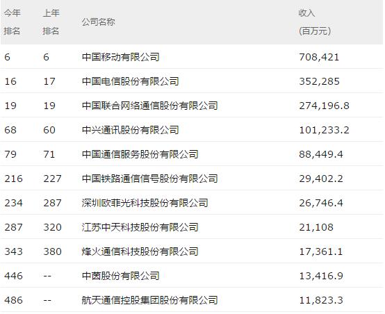 2017年財富中國500強分行業(yè)榜:通訊和通訊設(shè)備