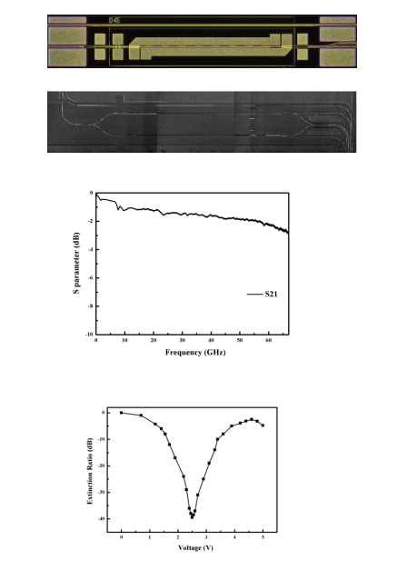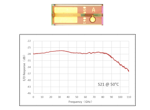 InP-MZM/IQ-MZI芯片:高電光帶寬+優(yōu)驅(qū)動(dòng)特性,強(qiáng)化信號調(diào)制性能:采用MMI+ MZM光學(xué)波導(dǎo)及CL-TWE電極方案,結(jié)合光波導(dǎo)優(yōu)化制程工藝實(shí)現(xiàn)EO帶寬>67GHz,DCER>30dB,Vπ=2.1V 特性參數(shù)。降低驅(qū)動(dòng)電路能耗,適配低功耗通信設(shè)備需求,為AI數(shù)據(jù)中心、5G承載網(wǎng)等場景提供高效調(diào)制解決方案。