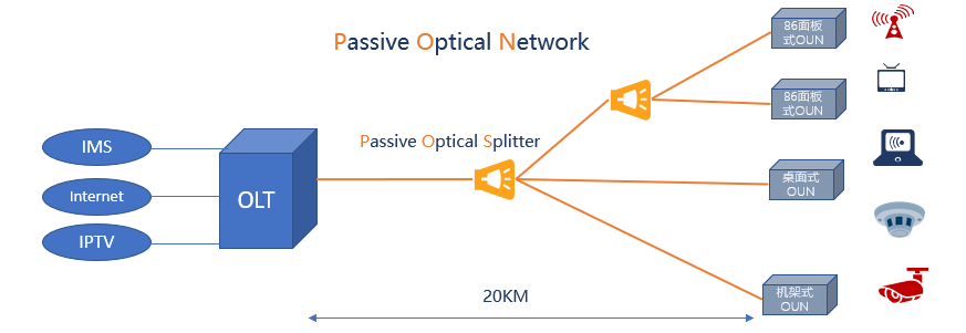 POL采用PON技術(shù);PON(Passive Optical Network)是一種點到多點(P2MP)結(jié)構(gòu)的無源光網(wǎng)絡(luò),其組成涵蓋三部分:OLT, ODN, ONU