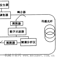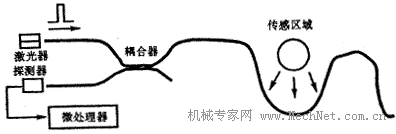 該傳感器的一般形式是,光的入射與探測分別處于光纖的兩端.如果傳感光纖支持不同傳播速度的兩種傳輸模,那么在一定外界條件的作用下,光纖本征傳輸模的一部分能量就會耦合到另一傳輸模。因此在光纖另一端輸出的耦合模的強度就能反映出被測量的大小,兩傳輸模之間的延遲時間則反映出耦合點的位置。