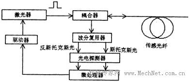 因而這一關(guān)系與光時域反射技術(shù)結(jié)合就可構(gòu)成分布式溫度傳感器。圖2是該類傳感器的基本結(jié)構(gòu)框圖。采用斯托克斯光與反斯托克斯光的強度比可消除光纖的固有損耗和不均勻性所帶來的影響。