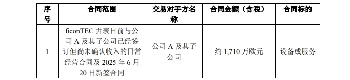 本次合同總金額約為 1710 萬歐元,包括 ficonTEC 并表日前與公司 A 及其子公司已簽訂但尚未確認收入的日常經(jīng)營合同以及 2025 年 6 月 20 日新簽合同,合同標的為設(shè)備或服務(wù)。羅博特科表示,美國某頭部公司 A 及其子公司與羅博特科及全資子公司 ficonTEC 不存在關(guān)聯(lián)關(guān)系,本次交易不屬于關(guān)聯(lián)交易。公司 A 及其子公司資信良好,具備履約能力。