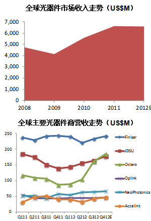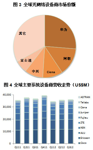 2012年迄今為止,全球光網(wǎng)絡(luò)設(shè)備市場整體表現(xiàn)不佳。一季度環(huán)比創(chuàng)多年來最大跌幅,二季度雖環(huán)比增長,但同比降幅仍達兩位數(shù),三季度有季節(jié)性疲軟。