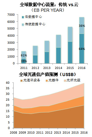 同時,在技術(shù)方面,華為中興也取得不少業(yè)界領(lǐng)先的成果。華為發(fā)布業(yè)界首個400G DWDM光傳送系統(tǒng),率先推出百億兆全光交換原型機,發(fā)布全球頻譜效率最高的波分樣機,發(fā)布業(yè)界最大容量480G路由線卡,全球首發(fā)2T波分樣機和推出業(yè)界最大容量的分組傳送產(chǎn)品PTN 6900等;中興通訊推出業(yè)界首款運營級小型化OLT產(chǎn)品,此外,2012年9月,中興通訊試驗中采用其專利技術(shù)將40個波分信道的400Gb/s單載波極化復(fù)用的QPSK信號,成功實現(xiàn)了2800 公里長距離標準單模光纖的傳輸,刷新了此前單載波400G的傳輸1200公里的世界紀錄。