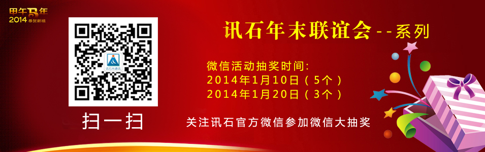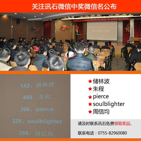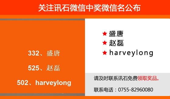 溫馨提醒:因騰訊禁止公眾帳號主動給用戶發(fā)私信,請所有中獎的微信粉絲于2014/01/29號之前主動聯(lián)系訊石工作人員領(lǐng)獎,未能領(lǐng)獎的用戶,訊石工作人員將把獎品累計(jì)歸下次活動抽取。