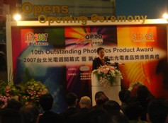 6月13日為光電展的開幕式上,臺(tái)北光電周籌備會(huì)主委石大成博士發(fā)言并為十大杰出光電產(chǎn)品獎(jiǎng)獲得企業(yè)頒獎(jiǎng)。據(jù)石博士介紹,今年光電周系列展包括光電展、LED照明展,以及因應(yīng)全球綠色能源趨勢(shì),首度舉行的太陽光電展等三大主題,及各式研討會(huì)、閉幕式與晚會(huì)、產(chǎn)品發(fā)表會(huì)及第十屆十大杰出光電產(chǎn)品獎(jiǎng)等活動(dòng),統(tǒng)稱臺(tái)北光電周系列活動(dòng)。今年光電展的光通訊和光學(xué)廠商包括亞洲光學(xué)、中華電信、光電科技工業(yè)協(xié)進(jìn)會(huì)(PIDA)、千才科技、東岳光電、偉電科技、超昱光電科技、泰華科技、巨晰光纖等。相比去年,本屆參展的光通訊公司是算多的,但總體上還是偏少。千才科技股份有限公司今年也是第一次參展。